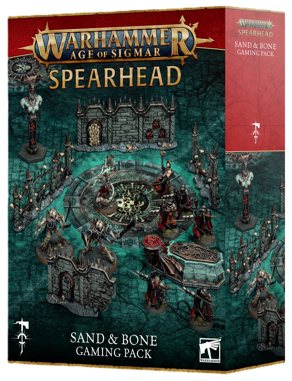 – 1x 24-page Spearhead: Sand and Bone book: Includes rules to get you started with games of Spearhead, from choosing your army, to the Battleplan: Sand and Bone, plus rules for the Cities of Sigmar: Fusil-Platoon, Seraphon: Sunblooded Prowlers, Ossiarch Bonereapers: Mortisan Elite, and Ogor Mawtribes: Scrapglutt Spearheads, and more.
